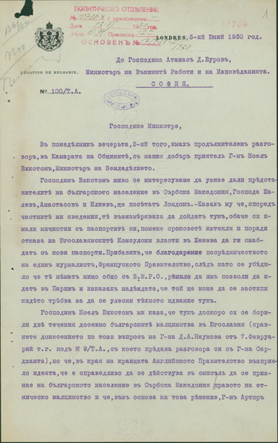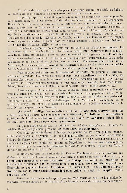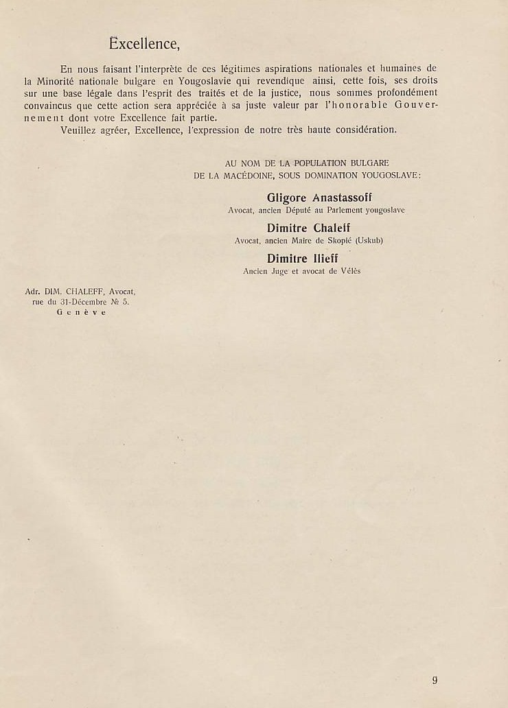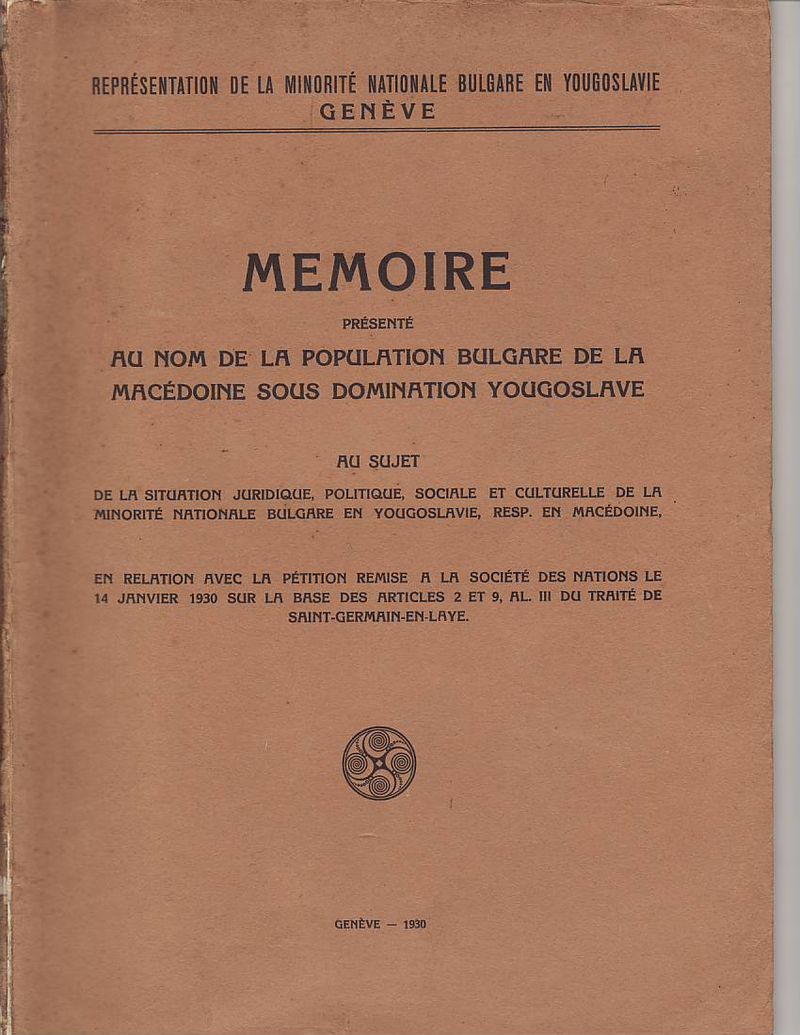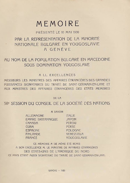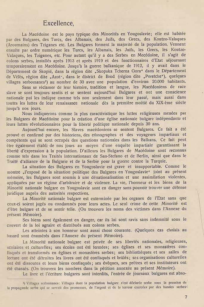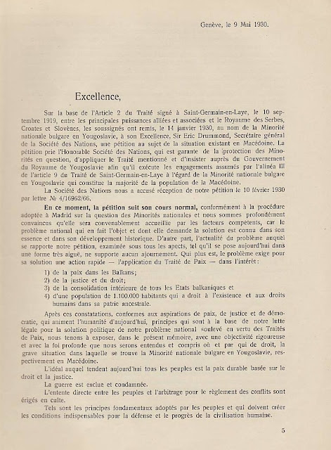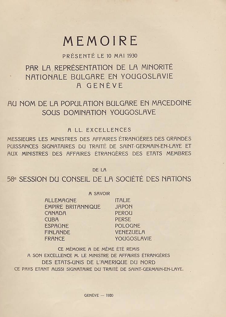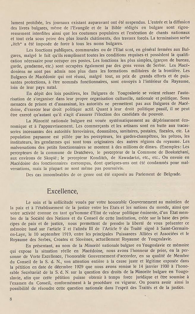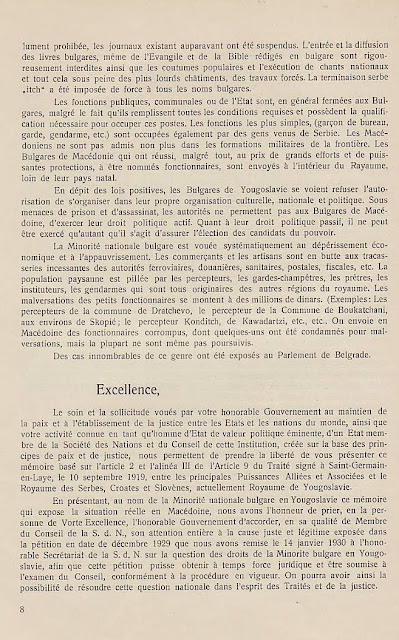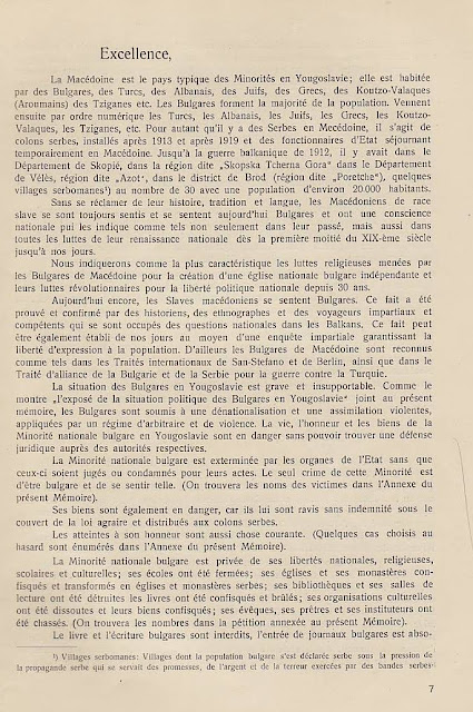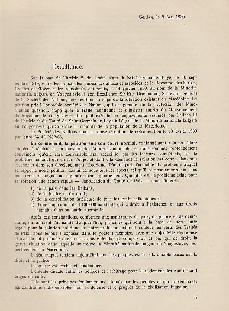 В преследването на своята политика за унищожаване на българщината в Македония югославянското правителство прибягва дори към мерки, които навсякъде се считат като пълно отрицание на съвременната цивилизация и елементарните понятия на свобода: а. Въпреки чл. 7 от Сержерменския договор, то ни забрани да си служим по улиците с нашия майчин български език, както в частните отношения, в търговията, в събранията и пр., без да може да става дума за употребяването на българския език в публикации и в печат. Употребяването на нашия български език в държавните, общинските и др. учреждения е напълно забранено: b. Нашите имена бяха насилствено променени със сръбски окончания. Кръщаването на нашите деца с национални имена е забранено и ние сме заставени да ги кръщаваме по един списък, изработен от сръбските църковни власти специално за Македония; с. Четенето на български книги и български вестници е забранено под страх на най-тежко наказание и ние никога нямаме възможност да прочетем нито един ред на нашия майчин език. Четирима младежи бяха осъдени в Кавадарци, защото у тях е била намерена една българска книга; d. Пението на български народни песни се счита за престъпление. В Тетово много граждани, начело с един свещеник, бяха осъдени, защото са пели на едно празненство български песни; е. Югославянските власти ни забраниха да празнуваме нашите национални и обичайни праздници, налагайки ни вместо тях сръбската „слава“; f. За да улеснят асимилацията, властите насилствено заставят да се женят млади момичета и жени от Македония за сръбски жандарми доверени там, и всички протести против това насилие досега са били без резултат, g. На македонската интелигенция се отказват всички общински и държавни служби. Техните заявления се оставят без последствие и самите те се пропъждат от кралството, както беше случая с г-жа д-р Пиперкова от Скопие, д-р Наумов от Охрид, д-р Ципушев от Велес, или се интернират както е случая с инж. Караджов и д-р Тошанов от Щип, или се убиват, какъвто беше недавна случая с Благой Монев от Щип, Рампо Попов от Прилеп и пр. – без да говорим за многобройните убийства, които станаха по-рано. Ваше превъзходителство, Българското население в Македония има дълбока вяpa към великата мисия на ОН и иска да вярва, че то бди над точното прилагане на между народните договори. Затова, имайки съзнание за правата, които му са гарантирани като малцинство от Сенжерменския договор и въпреки големите страдания поради насилствената асимилация на югославянското правителство, българското население в Македония, организирано в своите национални организации, реши да ни изпрати в Женева в качеството на негови законни представители, за да отправим до ОН тая петиция и да искаме неговата протекция в качеството ни на национално малцинство в Югославия – нещо, от което до сега ние не сме ползували, вследствие познатото поведение на югославянското правителство. Ние, долуподписаните югославянски поданици, родени и живущи в Македония сме заемали разни обществени и политически служби и сме участвували в политическия живот па нашата страна, в качеството си на представители на българското национално малцинство в Югославия, приехме деликатната и патриотическа мисия да отправим до ОН тая петиция, убедени, че с тоя акт ние изпълняваме един дълг към нашия собствен народ и 